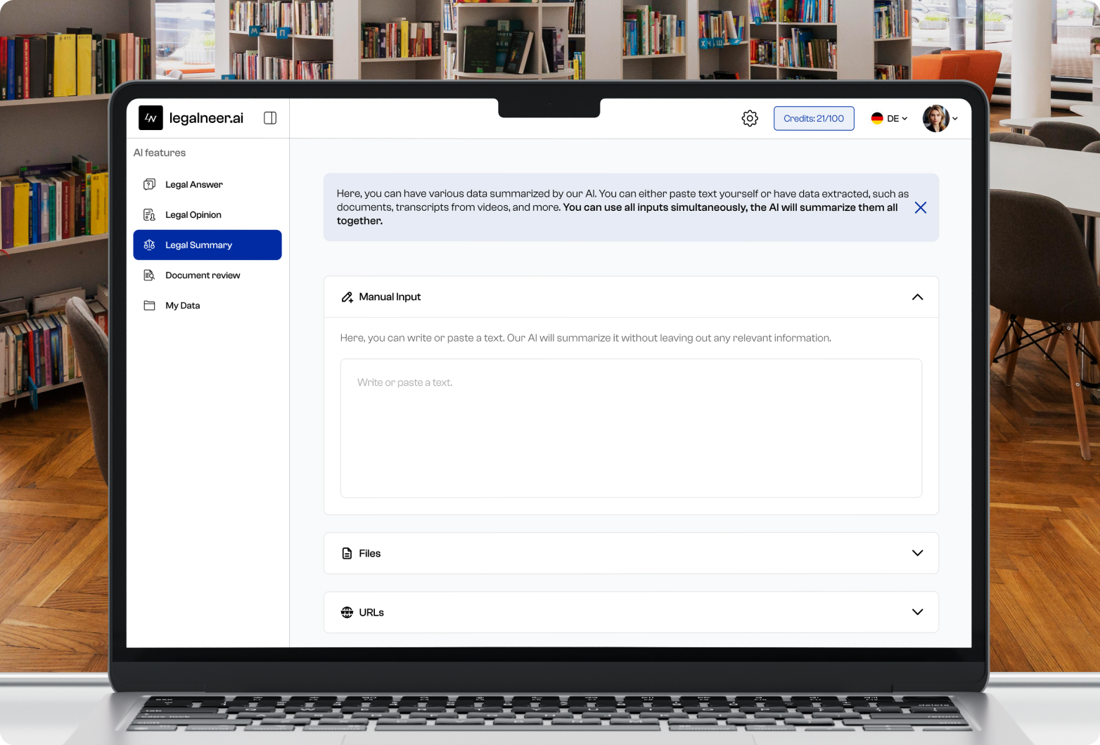The LegalSummary function enables users to summarise data using AI. Text can be entered manually or extracted from various sources, such as documents and video transcripts. All inputs are processed simultaneously, with the AI producing a consolidated summary. This allows you to efficiently summarise the core content of legal content and gain concise, meaningful overviews in no time.